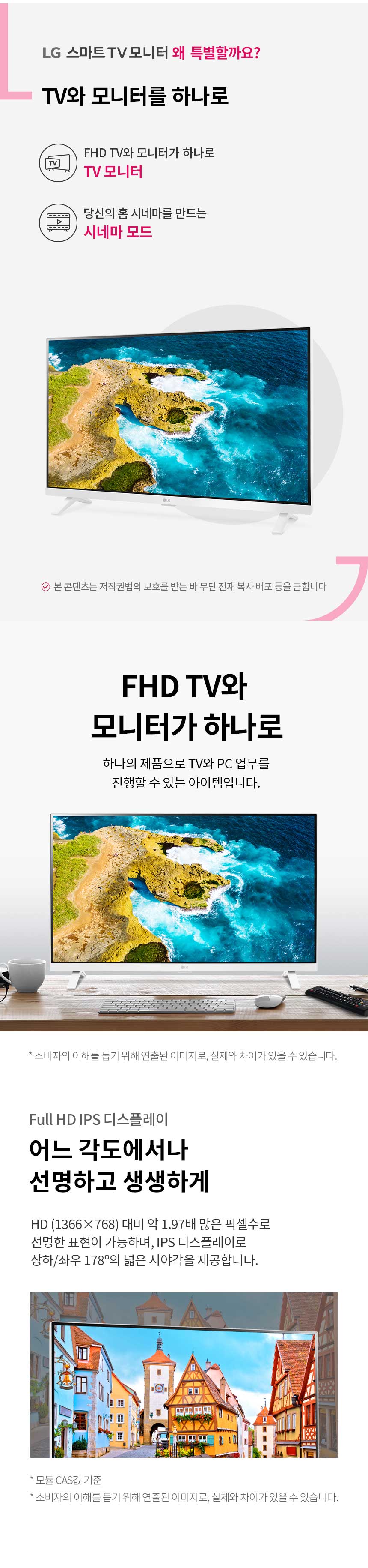 | 부가기능 | HDCP, 블루투스 오디오, 음성안내, 자동/수동 시간설정, 자동꺼짐 / 수면모드설정, Plug & Play (DDC2B), 리모컨컨트롤, 수면모드 타이머, 꺼짐/켜짐 타이머설정, 눈이 편안한 모드, 모션아이케어, 음악재생, 사진&영상, 스마트에너지세이빙(절전) |