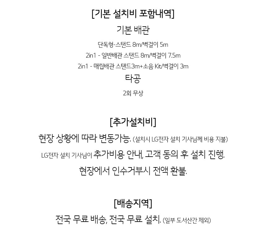가. 직접 설치 배송의 경우 LG전자의 정식 배송기사님께서 무료로 직접 설치 해 드립니다. (단, 설치 환경에 따라 추가 설치비가 발생할 수 있습니다.)