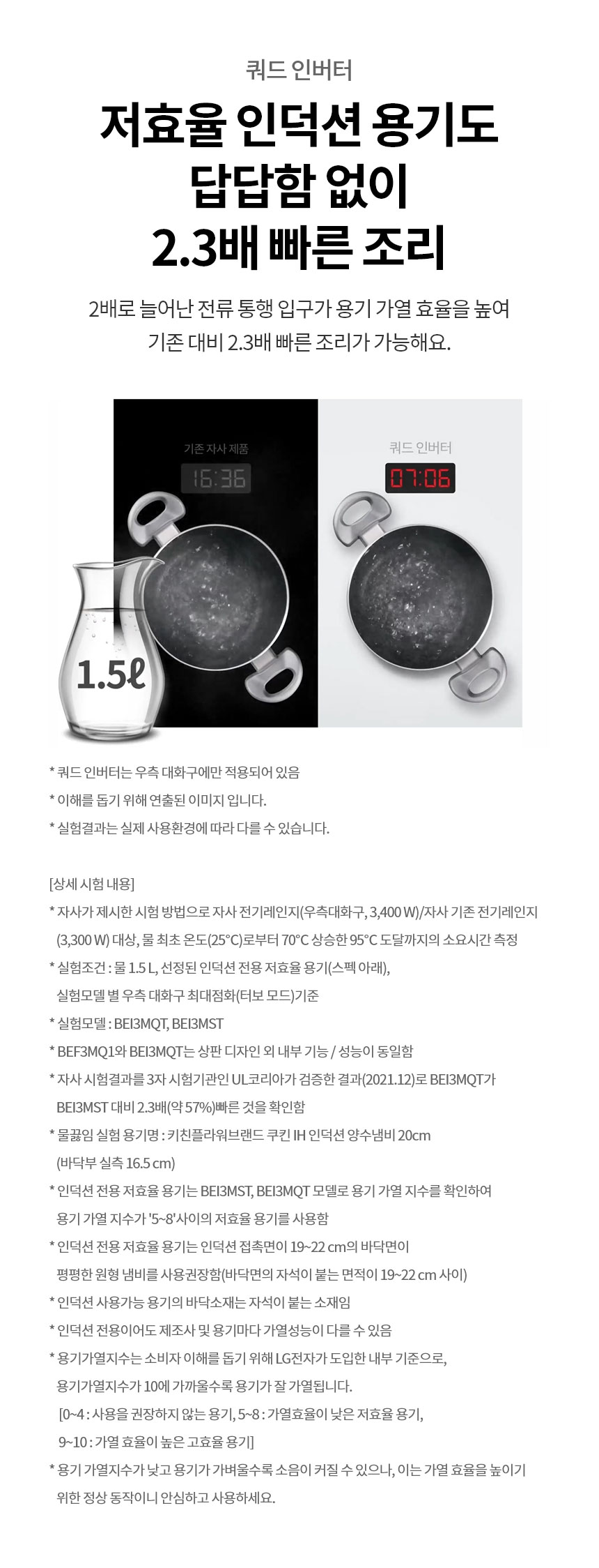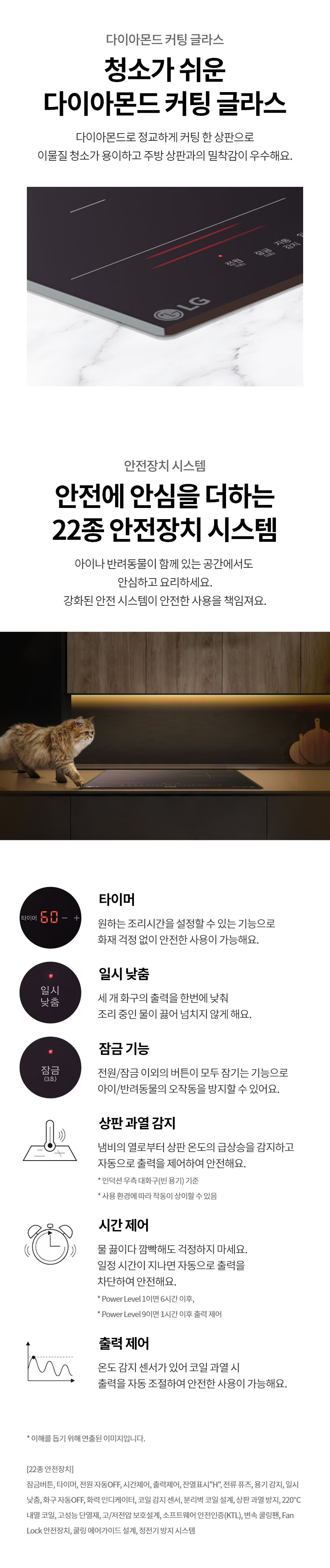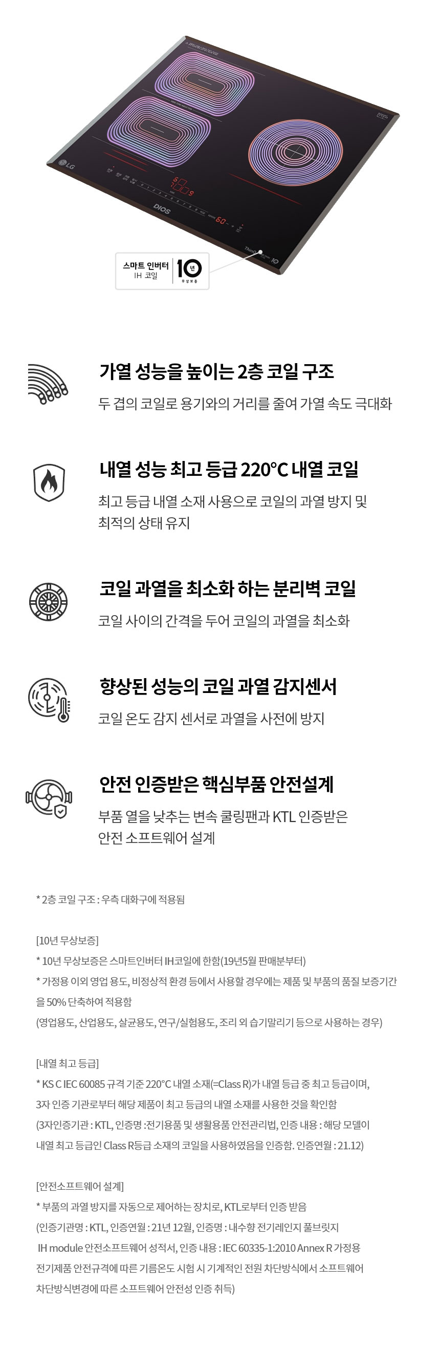 | 안전장치 세부항목 | 220℃ 내열 코일, Fan Lock 안전장치, 고/저전압 보호설계, 고성능 단열재, 변속 쿨링팬, 분리벽 코일 설계, 상판 과열 방지, 소프트웨어 안전인증(KTL), 시간제어, 용기감지, 일시낮춤, 잔열표시 "H", 잠금기능, 전류퓨즈, 전원 자동 OFF, 정전기 방지 시스템, 출력제어, 코일 감지 센서, 쿨링 에어가이드 설계, 타이머, 화구 자동 OFF, 화력 인디케이터 |