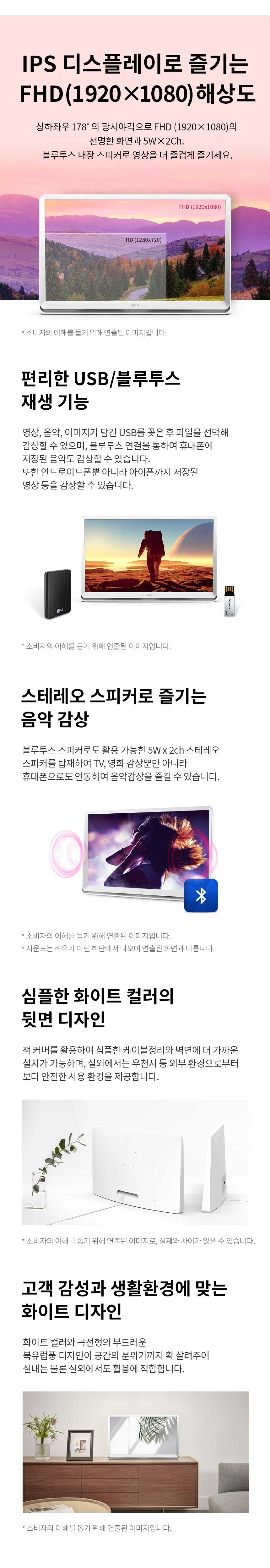 | 부가기능 | HDCP, 블루투스 오디오, 음성안내, 자동/수동 시간설정, 자동꺼짐 / 수면모드설정, Plug & Play (DDC2B), 리모컨컨트롤, 수면모드 타이머, 꺼짐/켜짐 타이머설정, 눈이 편안한 모드, 모션아이케어, 음악재생, 사진&영상 |