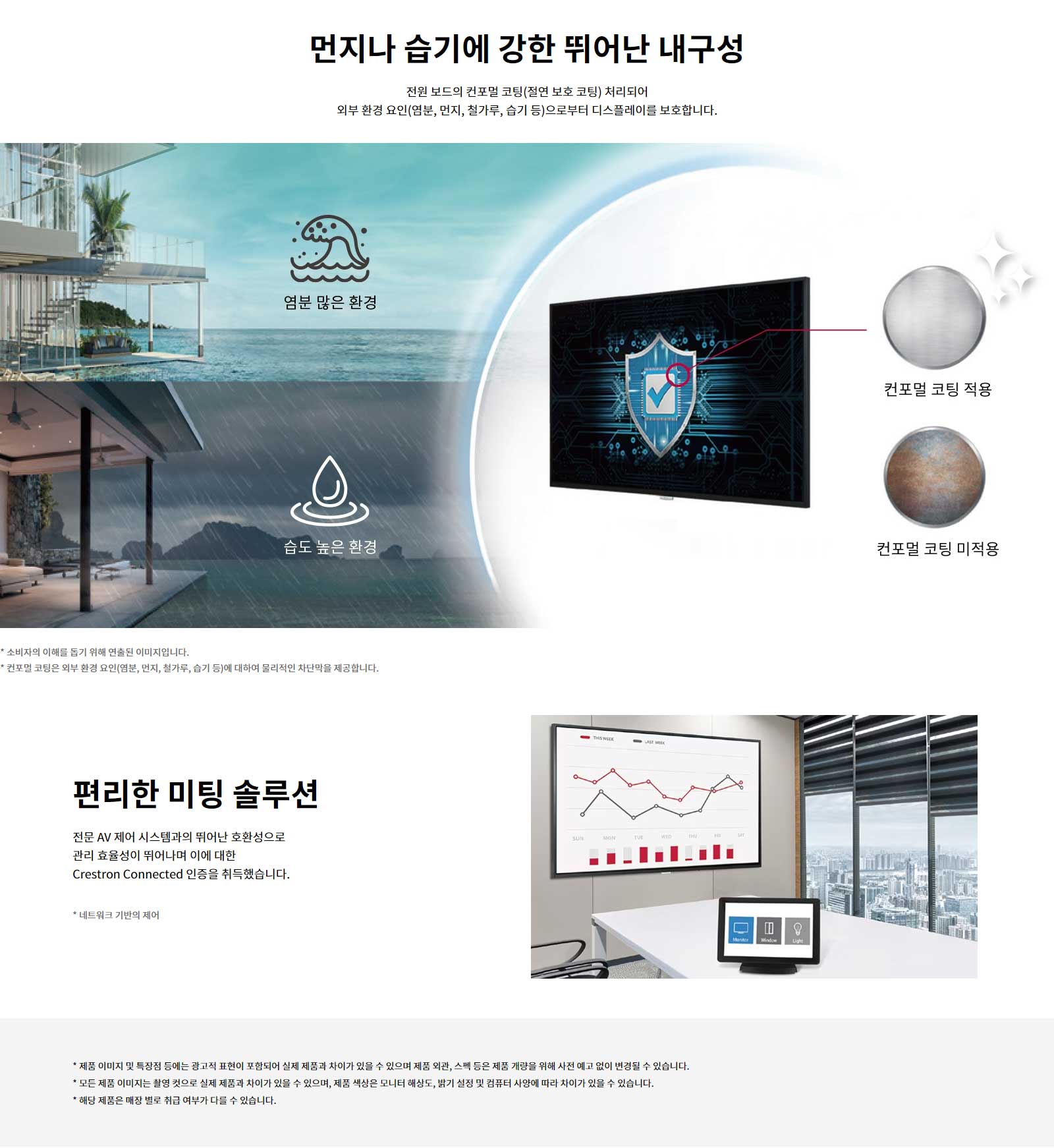 | 입력 | HDMI (3, HDCP 2.2/1.4/1.4), DP (HDCP 2.2/1.3), DVI-D (HDCP 1.4), Audio In, RS-232C (4 Pin Phone-jack), RJ45 (LAN), IR In, USB 2.0 Type A |