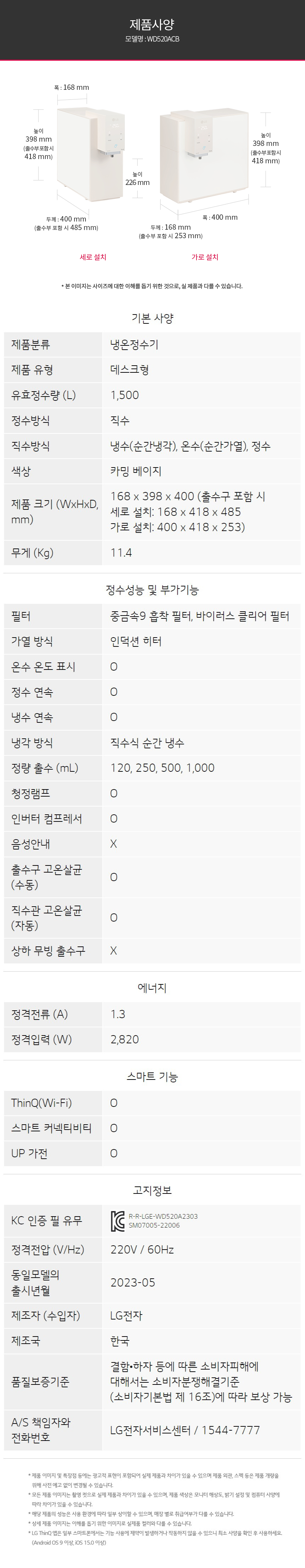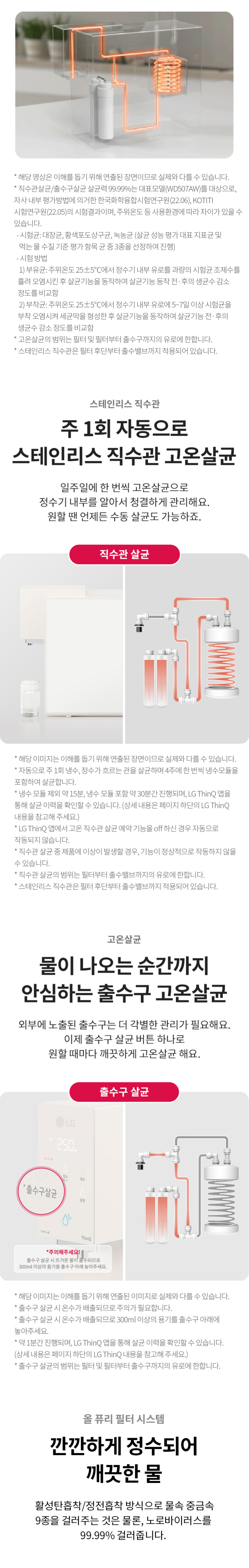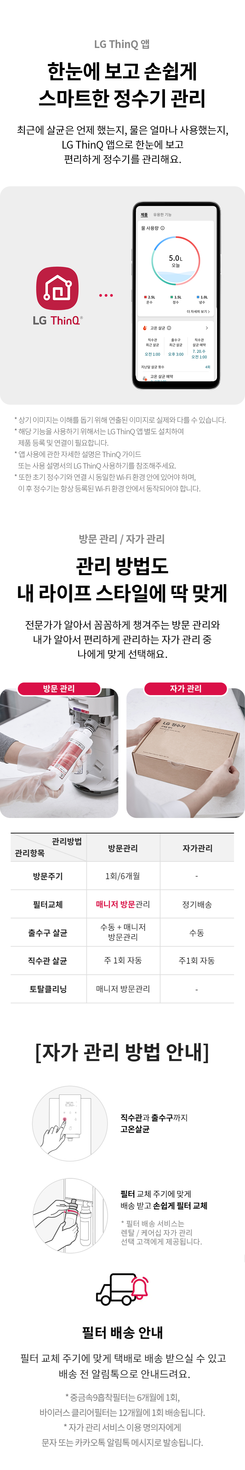 유의사항- 총 계약기간 동안 제품의 소유권은 회사(LG전자)에게 있습니다. - 계약/의무사용기간이 4년~6년인 상품은 계약기간 만료 후에 제품 소유권이 고객님께 이전됩니다. - 분실료 기준 : 제품판매가-{(제품판매가÷총 계약기간(개월 수) X 사용 개월 수}, 파손의 경우 분실료의 50% - 의무 사용기간 내에 해지 시 위약금 등 부대비용이 일부 발생할 수 있습니다. - 계약조건으로 지급 된 사은품에 대한, 비용 환수 기준 ①계약성립 후 12개월 이내 고객 요청에 의한 해지 시, 기 지급 받은 사은품에 해당하는 금액(전액)이 부과됩니다. ②현금성 사은품 : 사은품 액면 금액 / 비현금성 사은품: LG전자 사은품 구매단가 기준 적용 - 월 요금 납부일의 경우, 계약일 기준으로 자동 적용됩니다. - 제휴 카드의 전월 실적에 따라 구독 월 요금이 청구 할인됩니다. - 계약기간 종료 후에는 케어쉽을 이용하실 수 있습니다. |